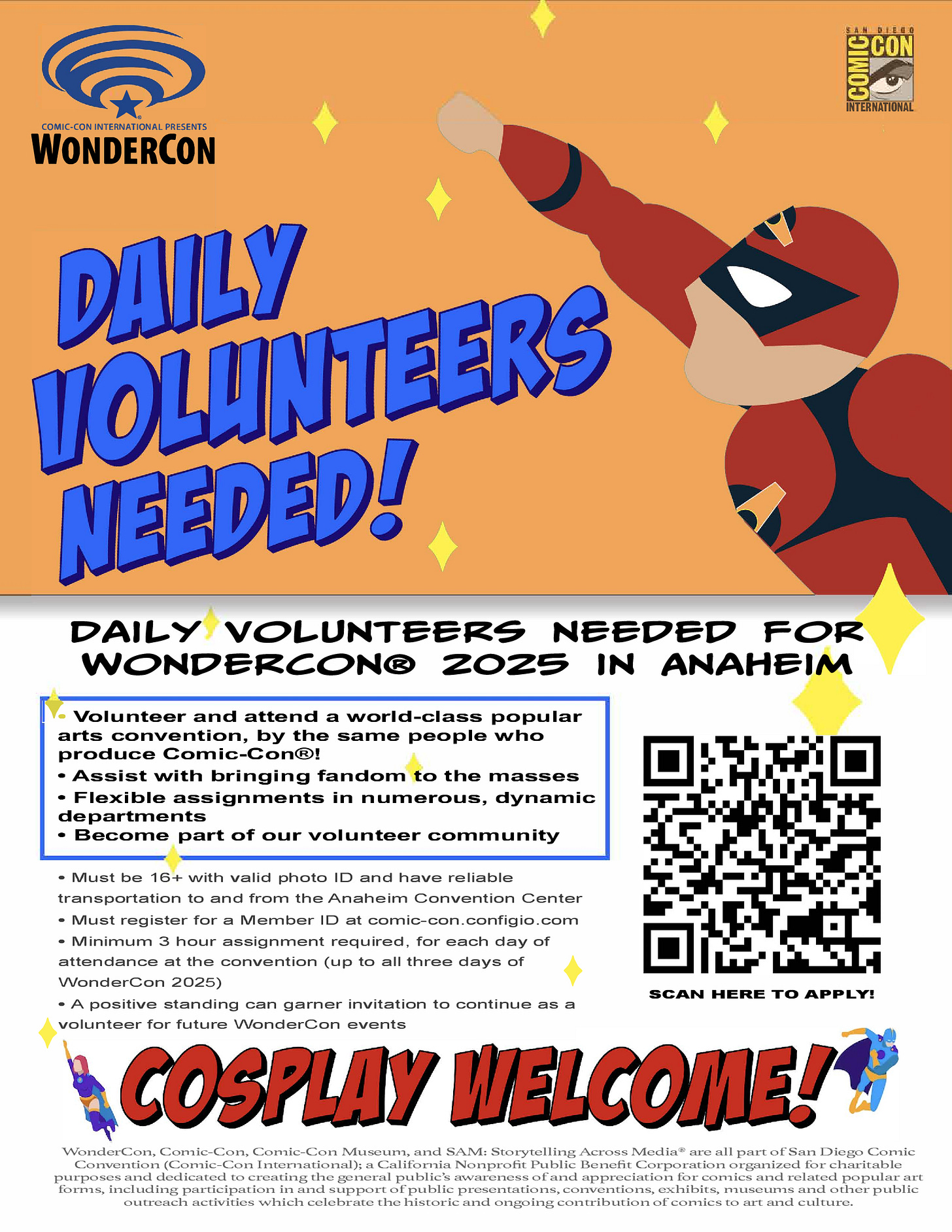 This is a fantastic opportunity for anyone interested in attending WonderCon 2025. Scan or click the poster below to sign up! (A Comic-Con Member ID is required.)